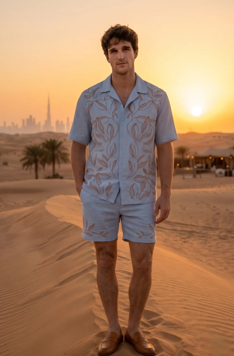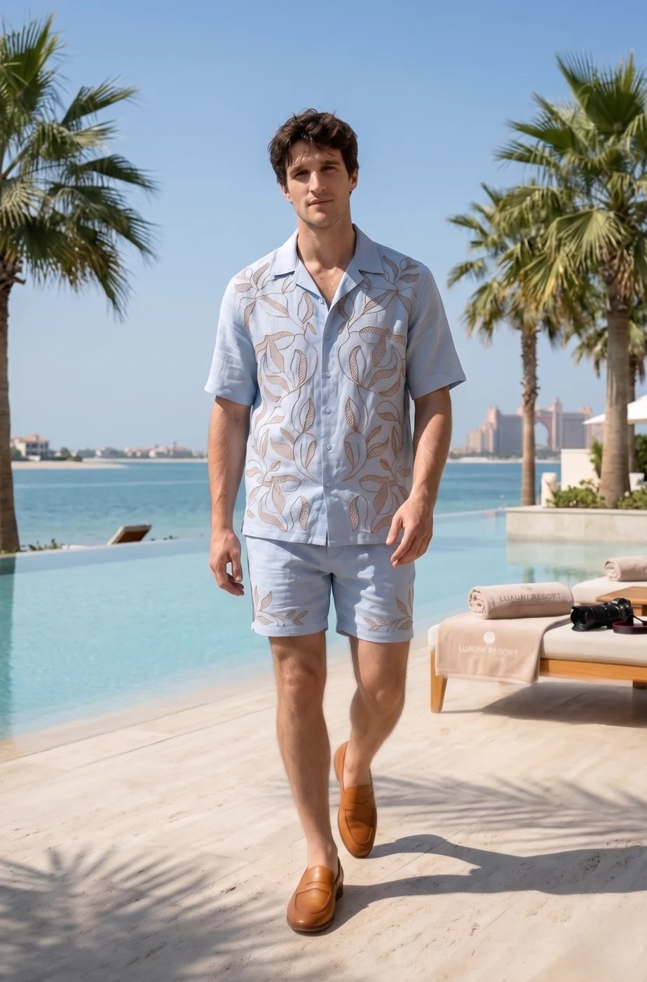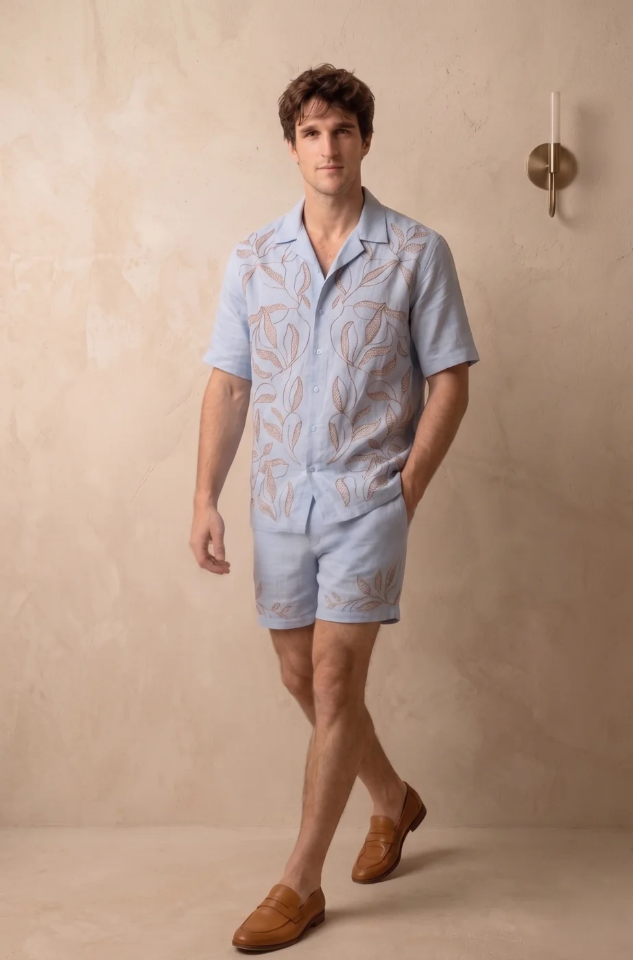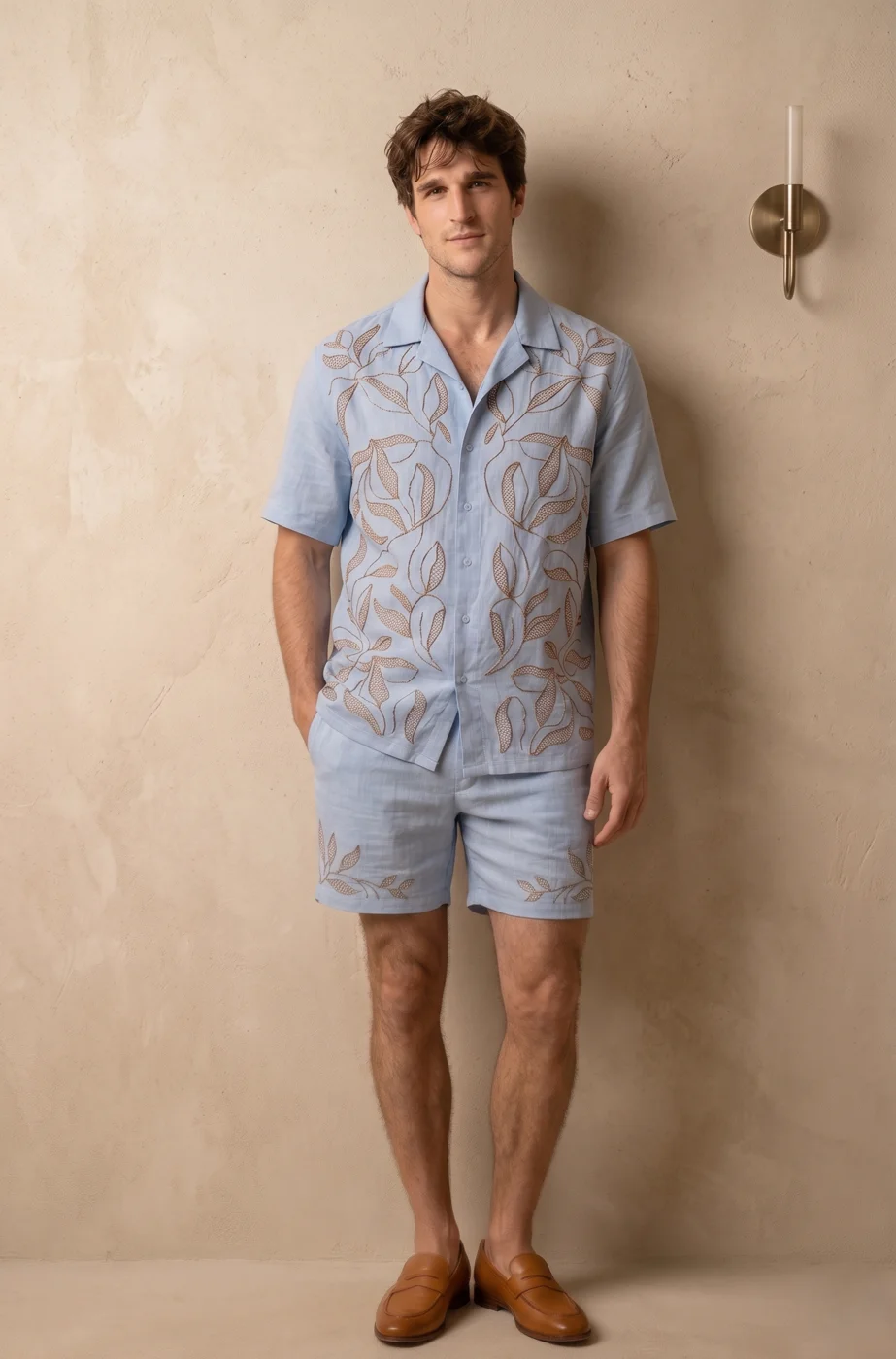 Blue Linen Shirt Short Set Men, Leaf Embroidery Cuban Collar Shirt, Summer Beach Outfit Men, Resort Wear Set