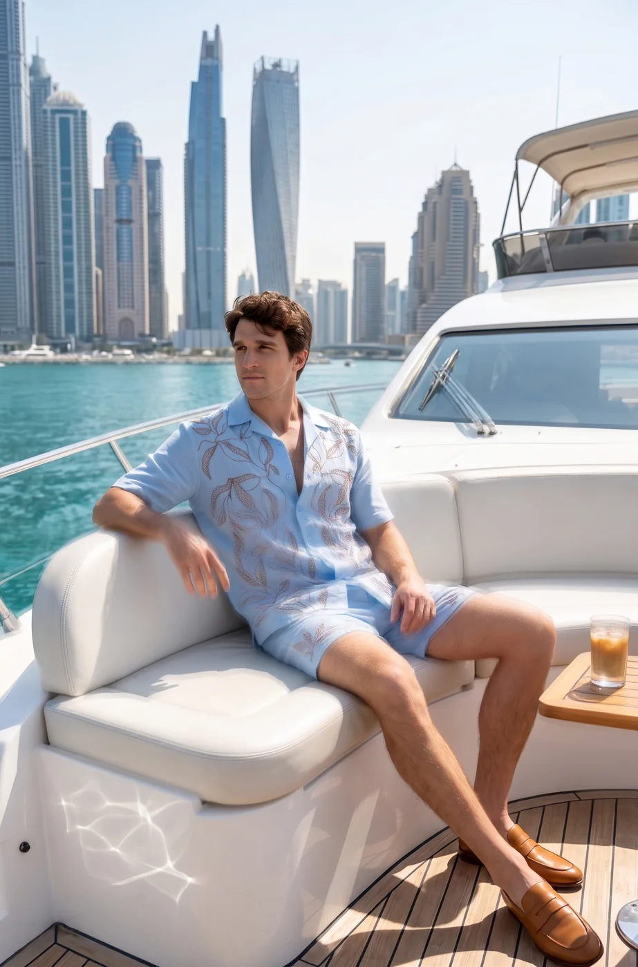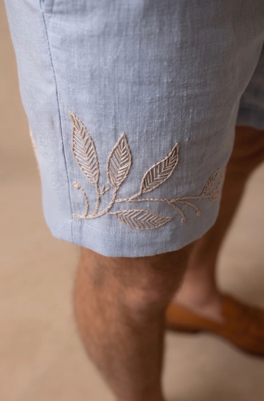 Make a bold statement with this premium blue Cuban collar shirt and short set featuring handcrafted leaf embroidery in fine threadwork.
