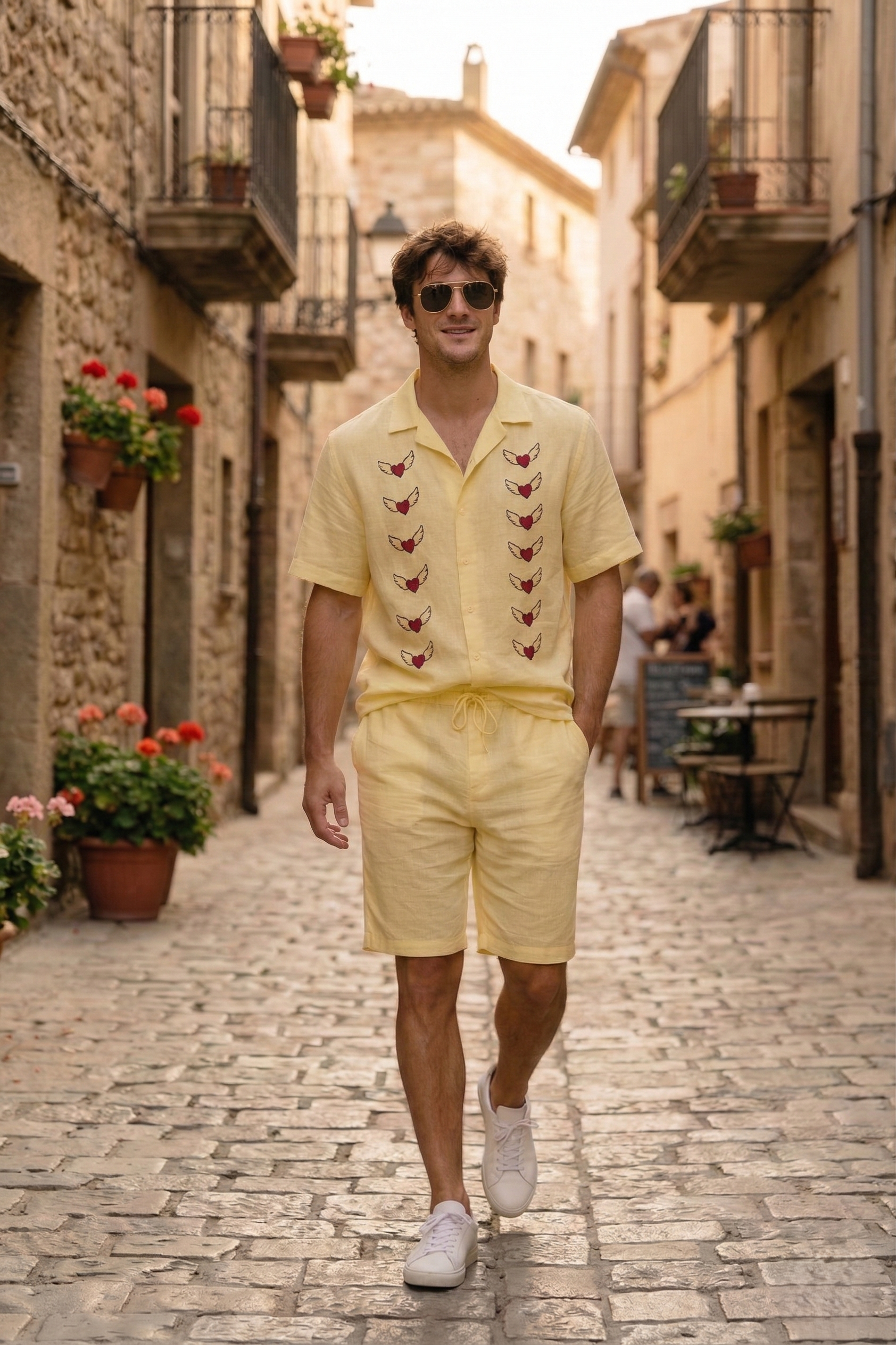 Hand Painted Heart Linen Shirt for Men – Handmade Embroidered Cuban Collar Summer Resort Shirt