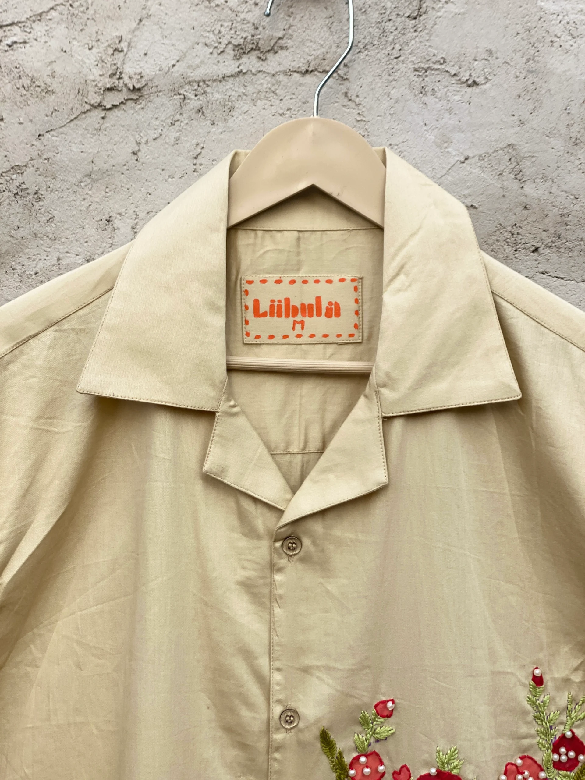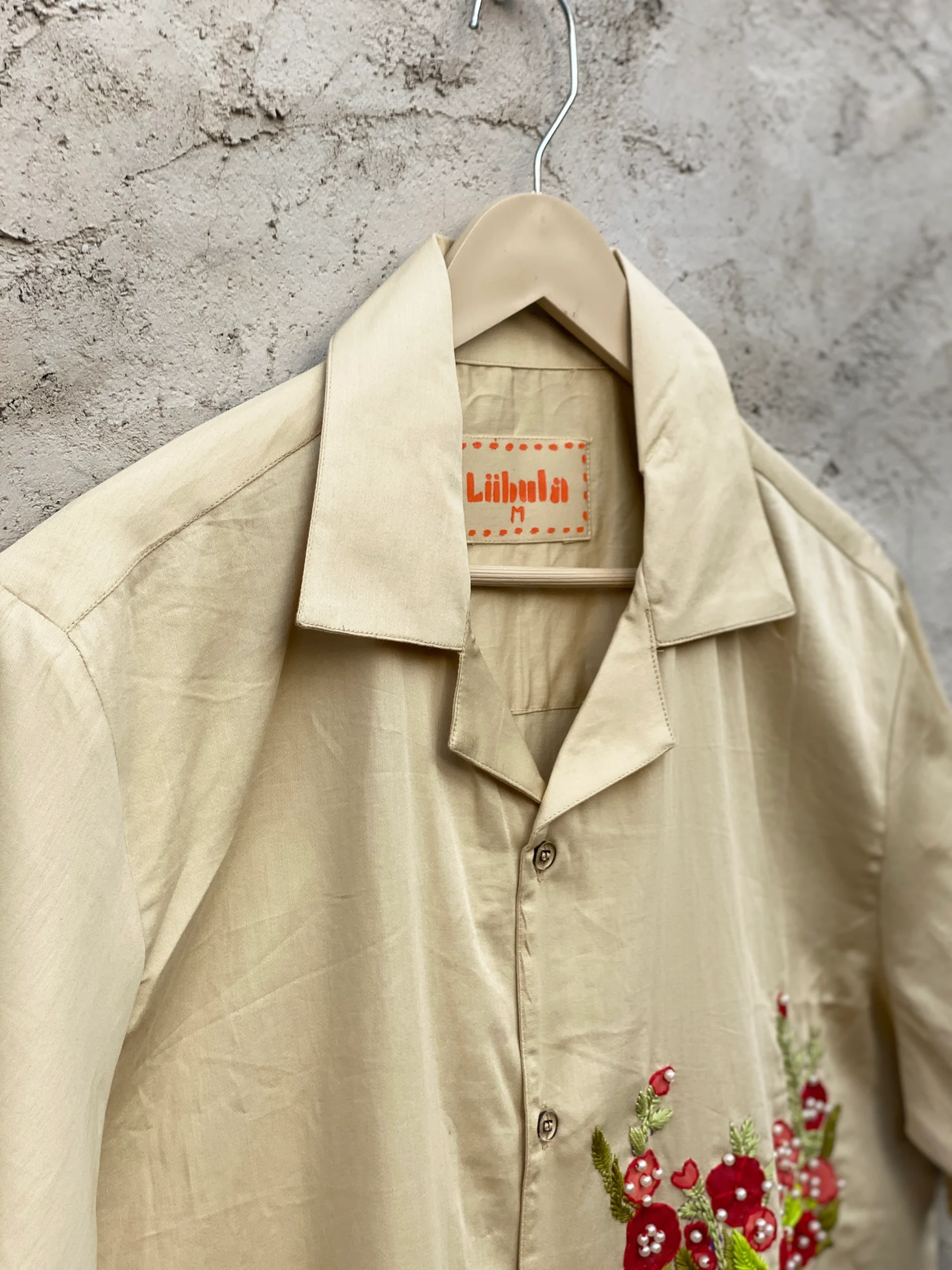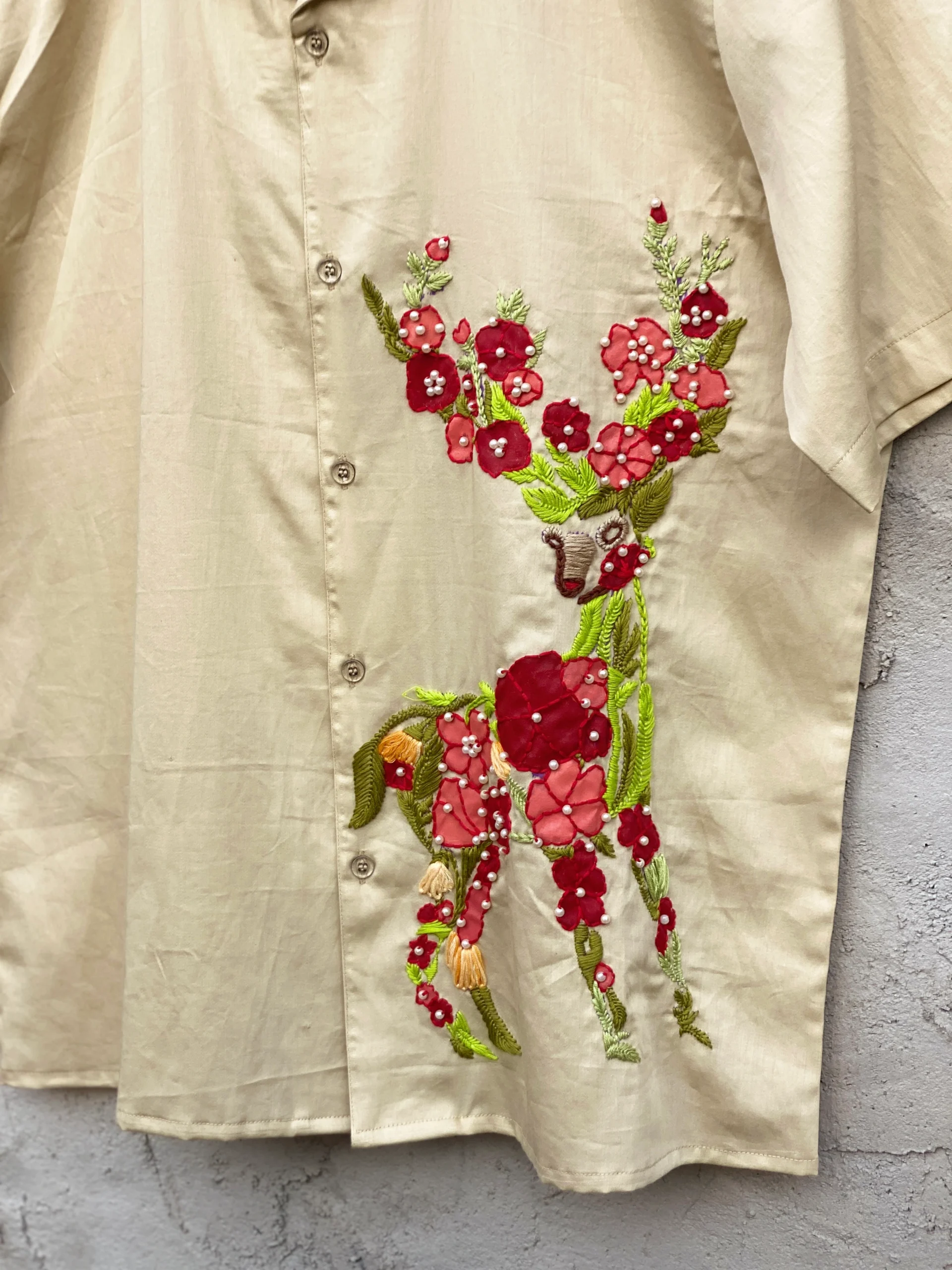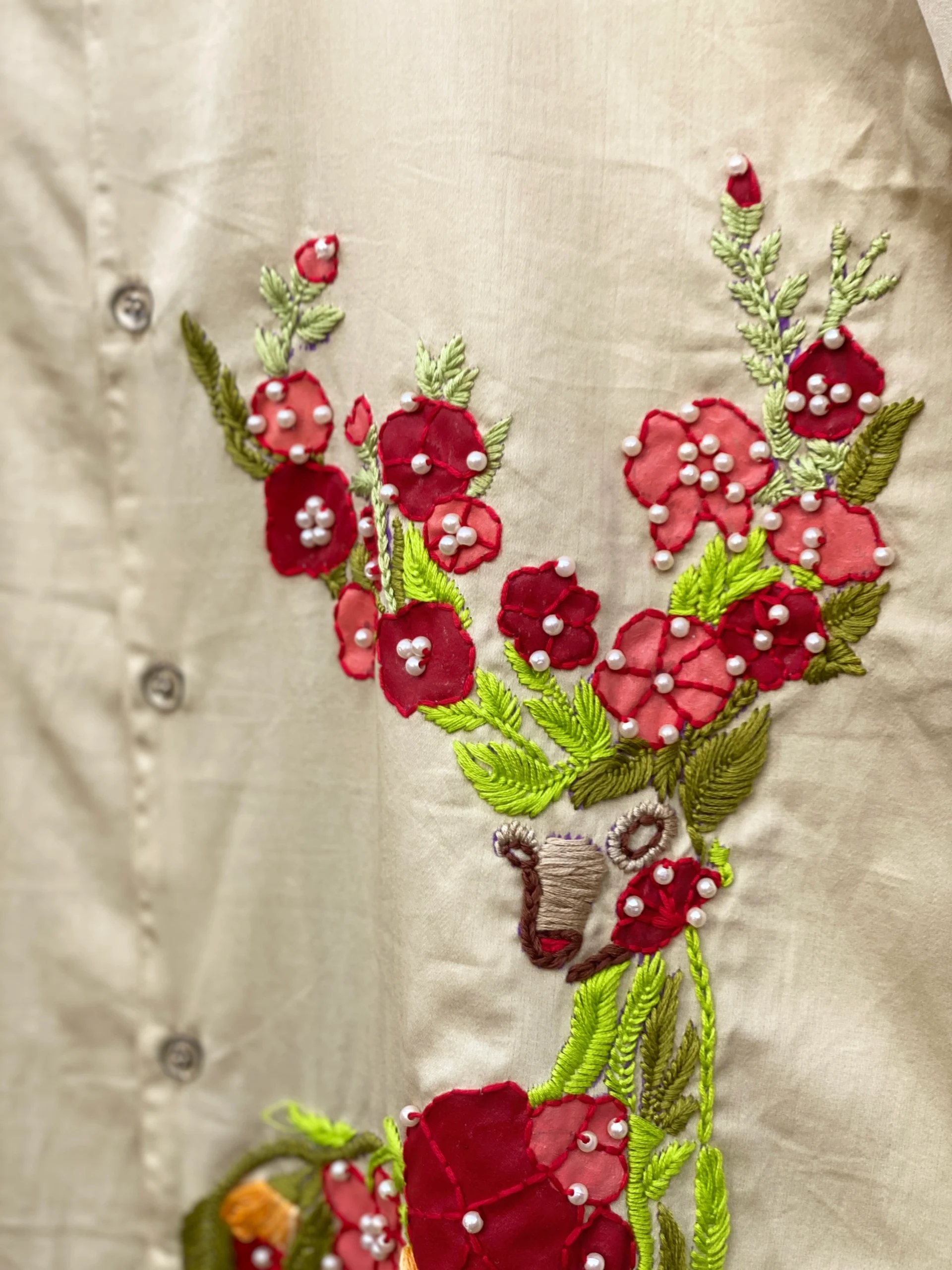 The Le Blooming Deer Shirt is a handcrafted 100% cotton shirt adorned with exquisite hand embroidery, hand-painted motifs, and pearl detailing.