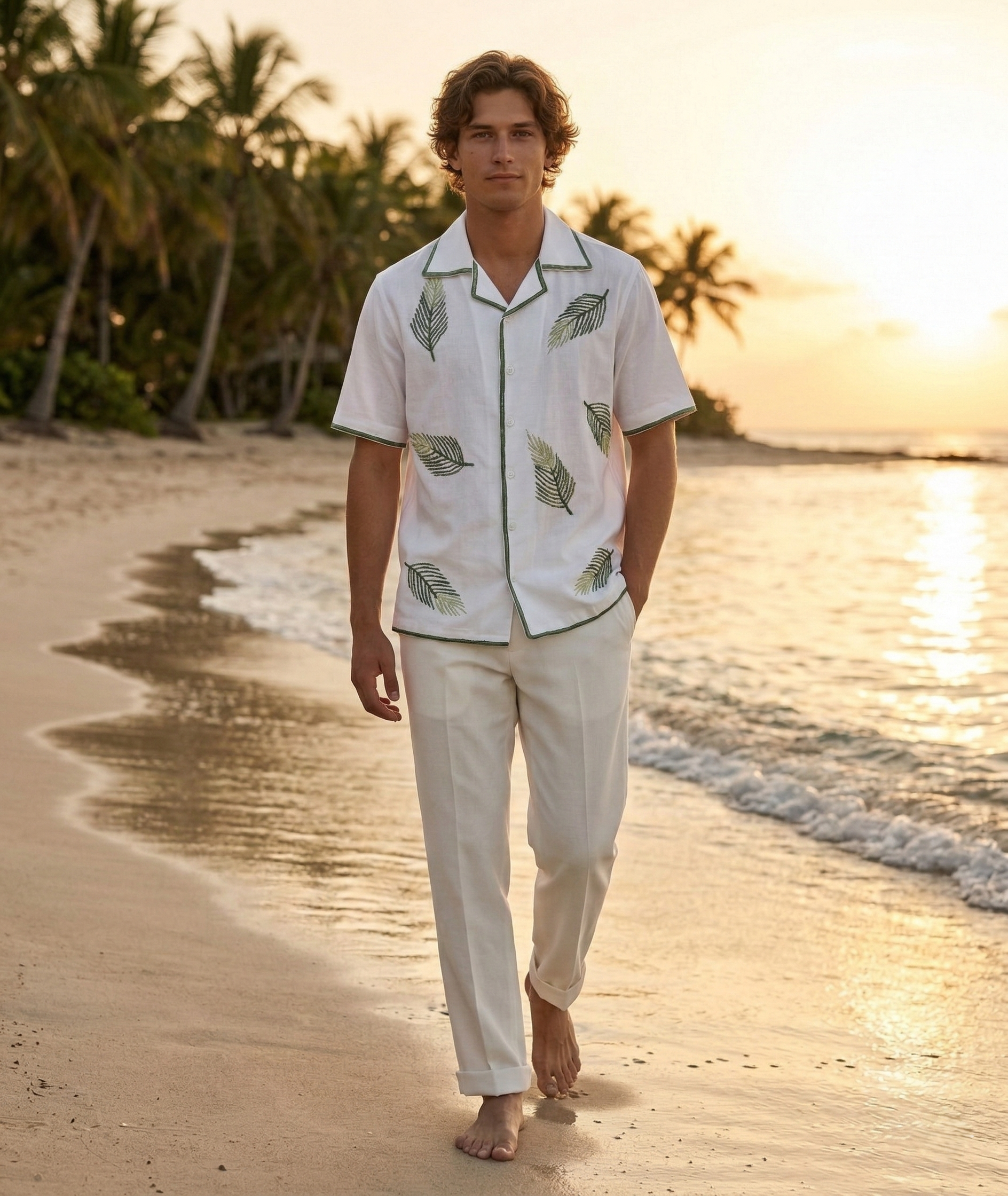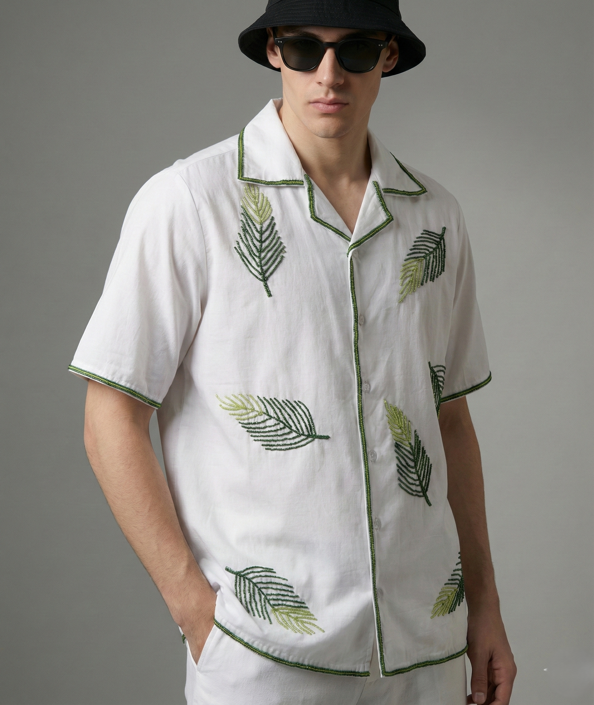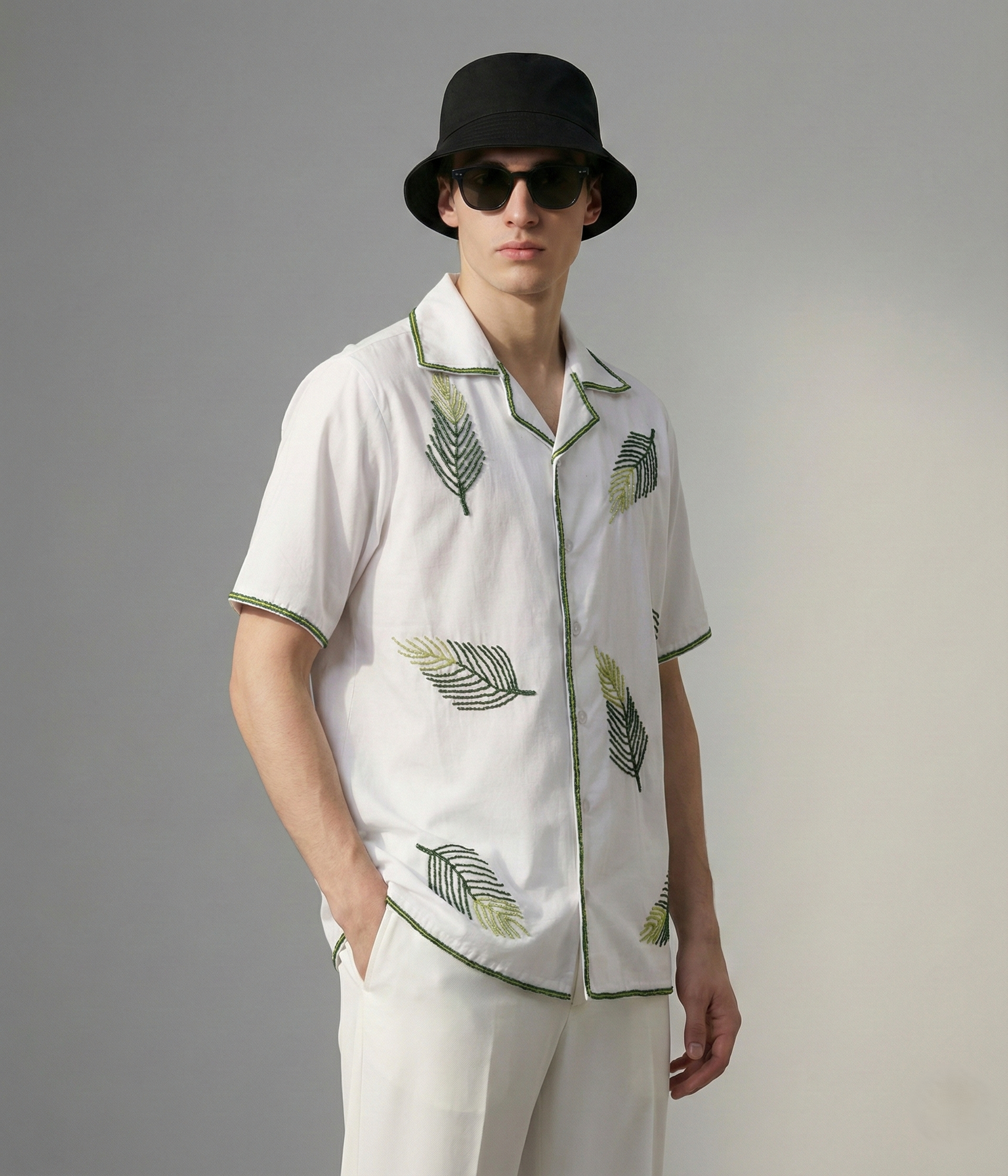 Handmade 100% cotton shirt with elegant leaf embroidery. Dry clean only.