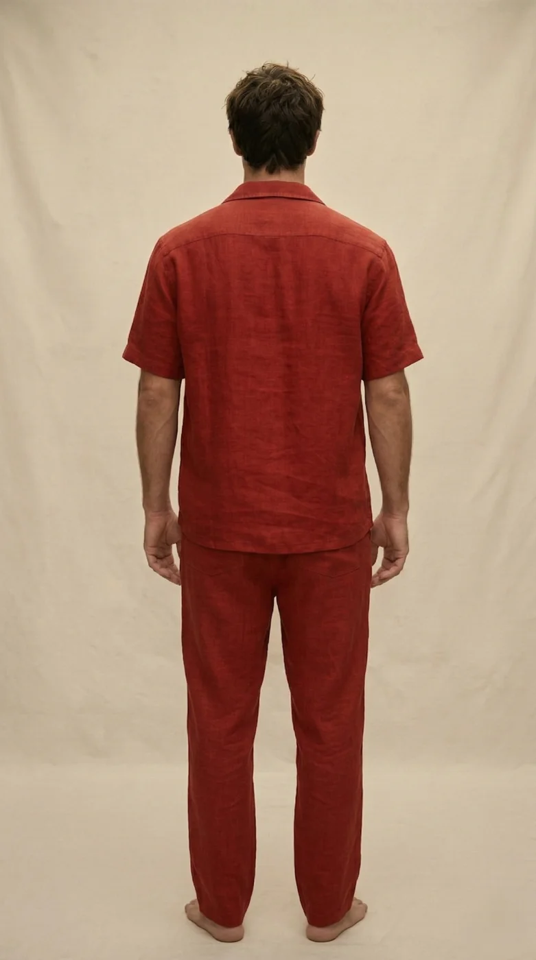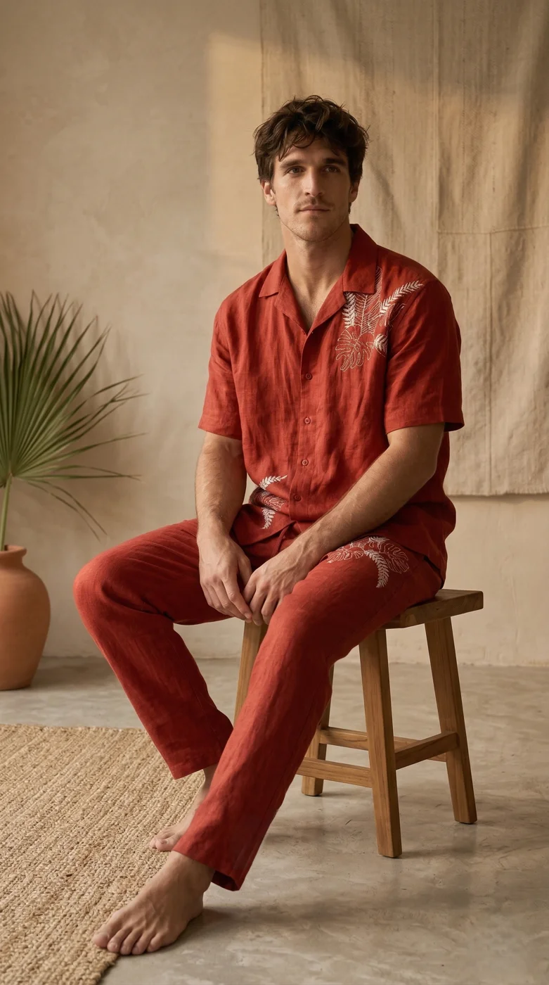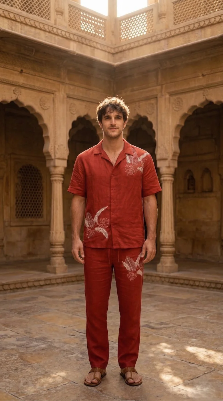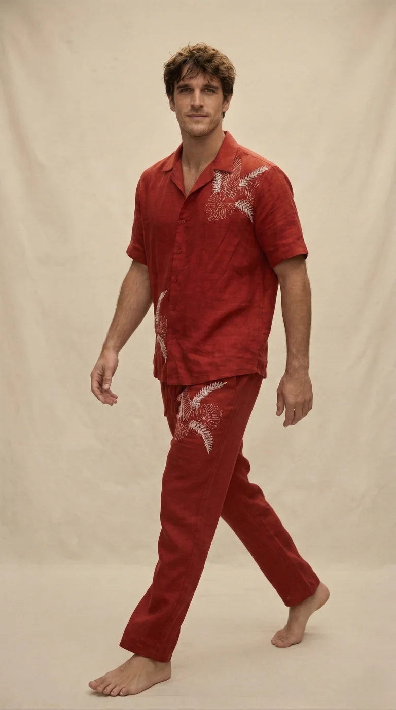 Premium Red Linen Cotton Co-Ord Set for Men Cuban Collar Shirt Pant Leaf Embroidery