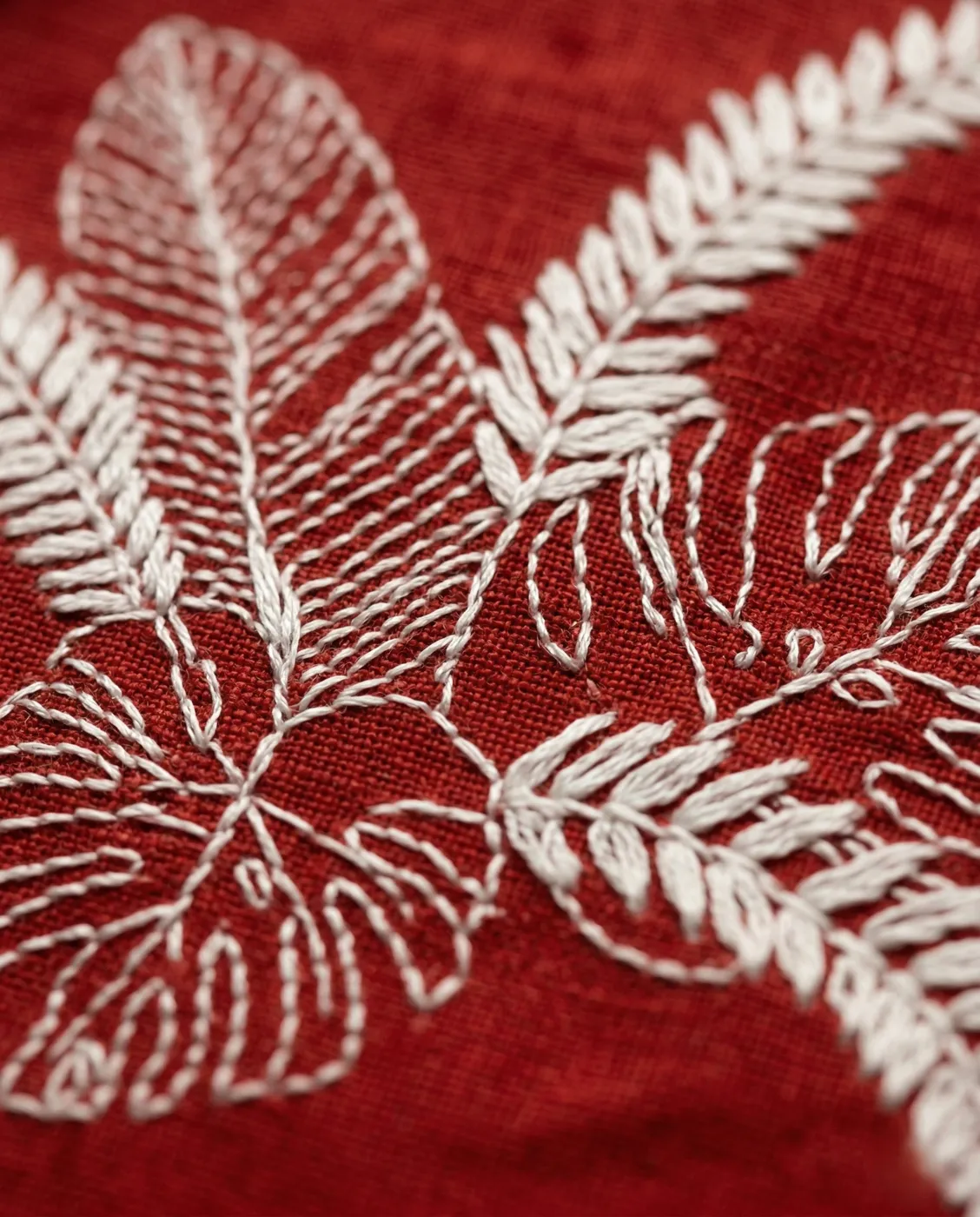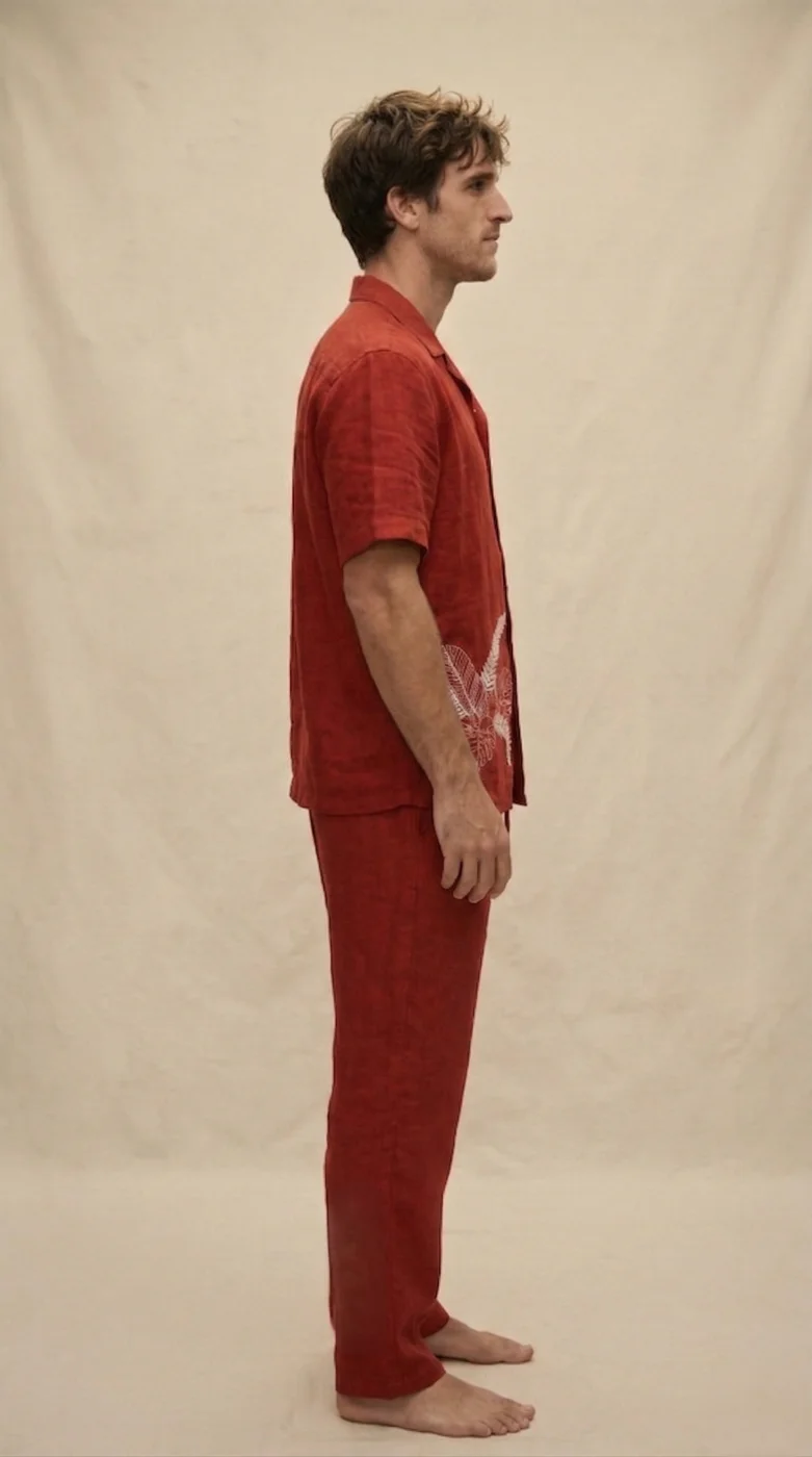 Make a bold statement with this premium red Cuban collar co-ord set featuring unique handcrafted leaf embroidery.