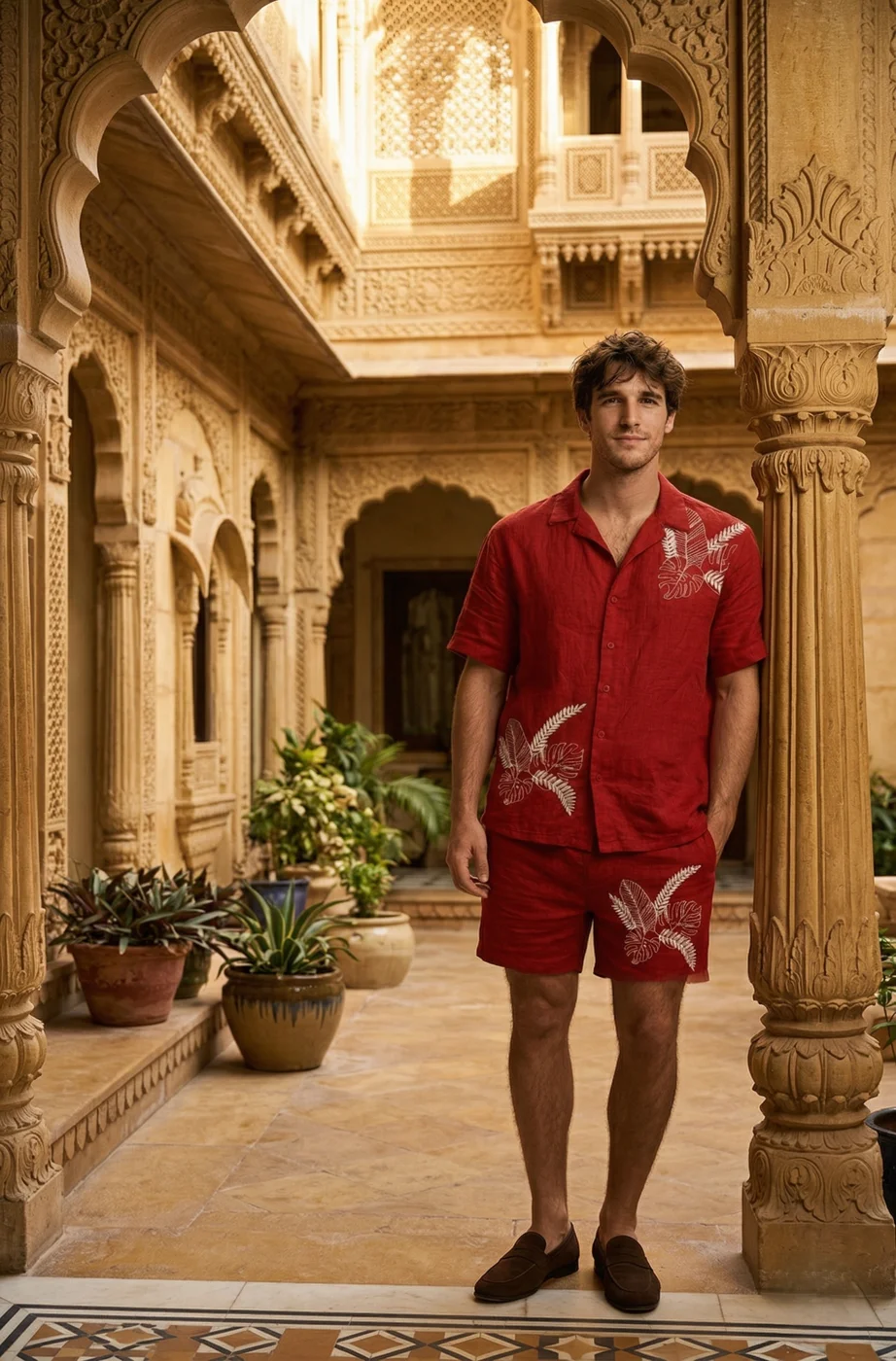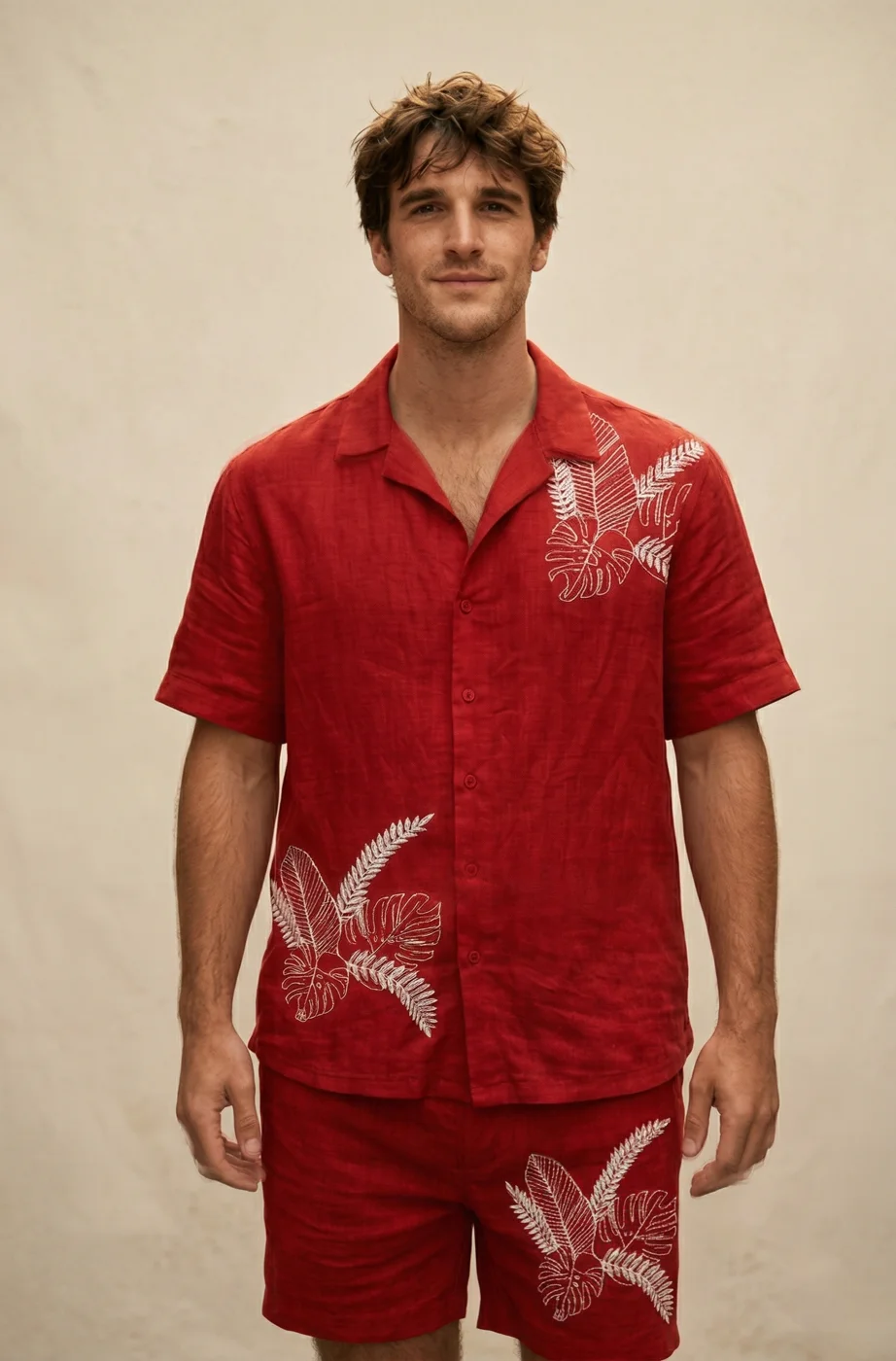 Elevate your wardrobe with this premium red Cuban collar shirt featuring handcrafted leaf embroidery.