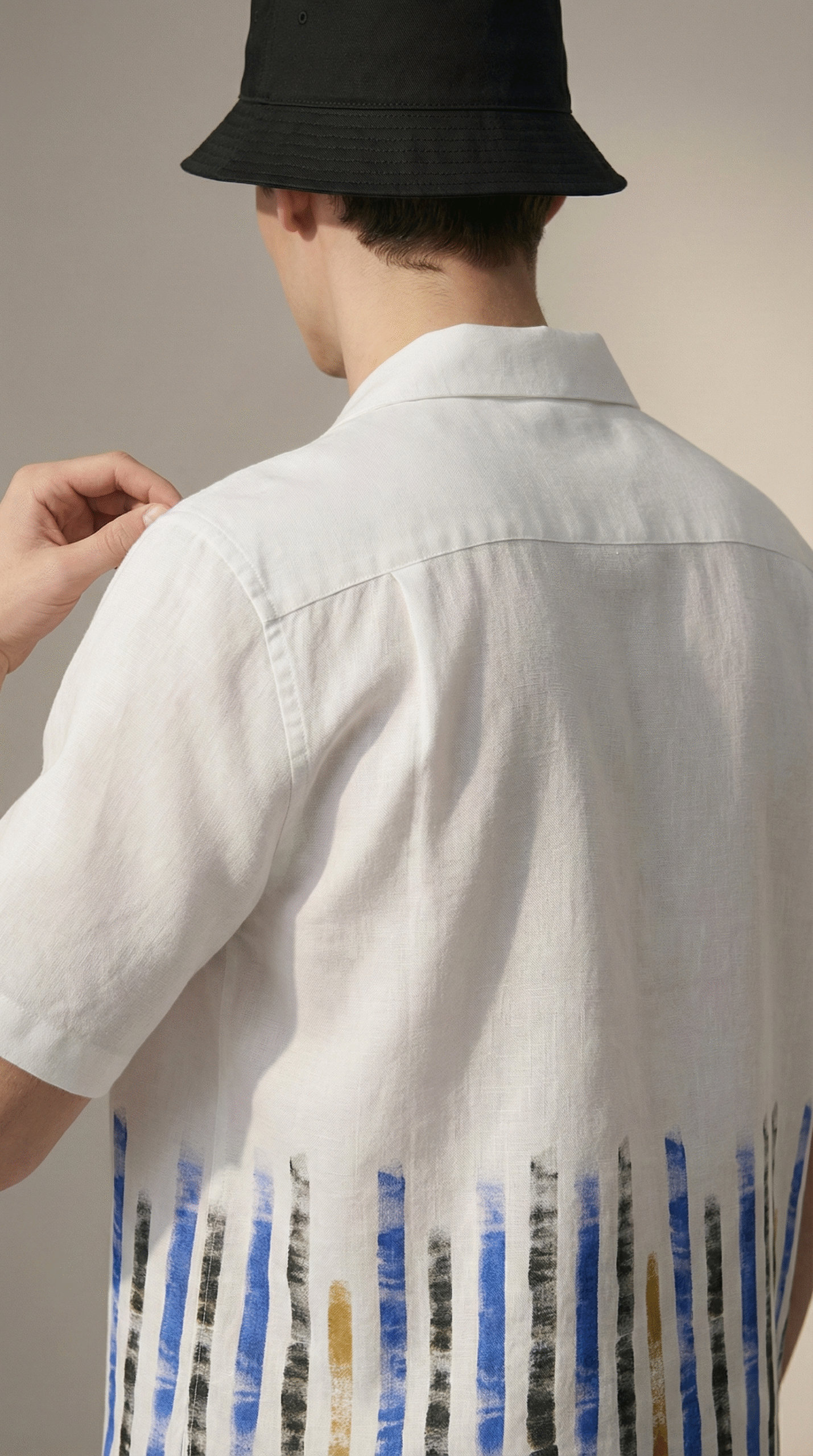 This Cuban collar shirt features a unique vertical stripe design in shades of blue, black, and yellow on a white background. Made from a cotton-linen blend fabric, it requires dry cleaning only.