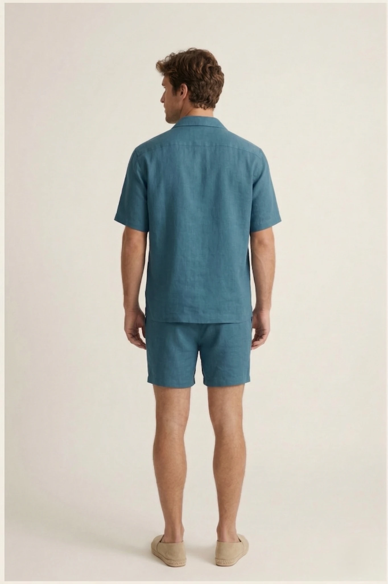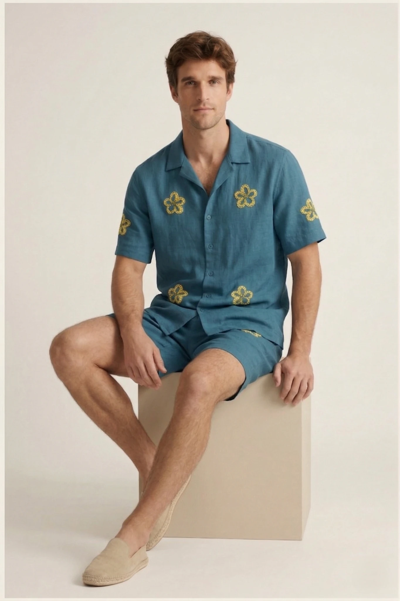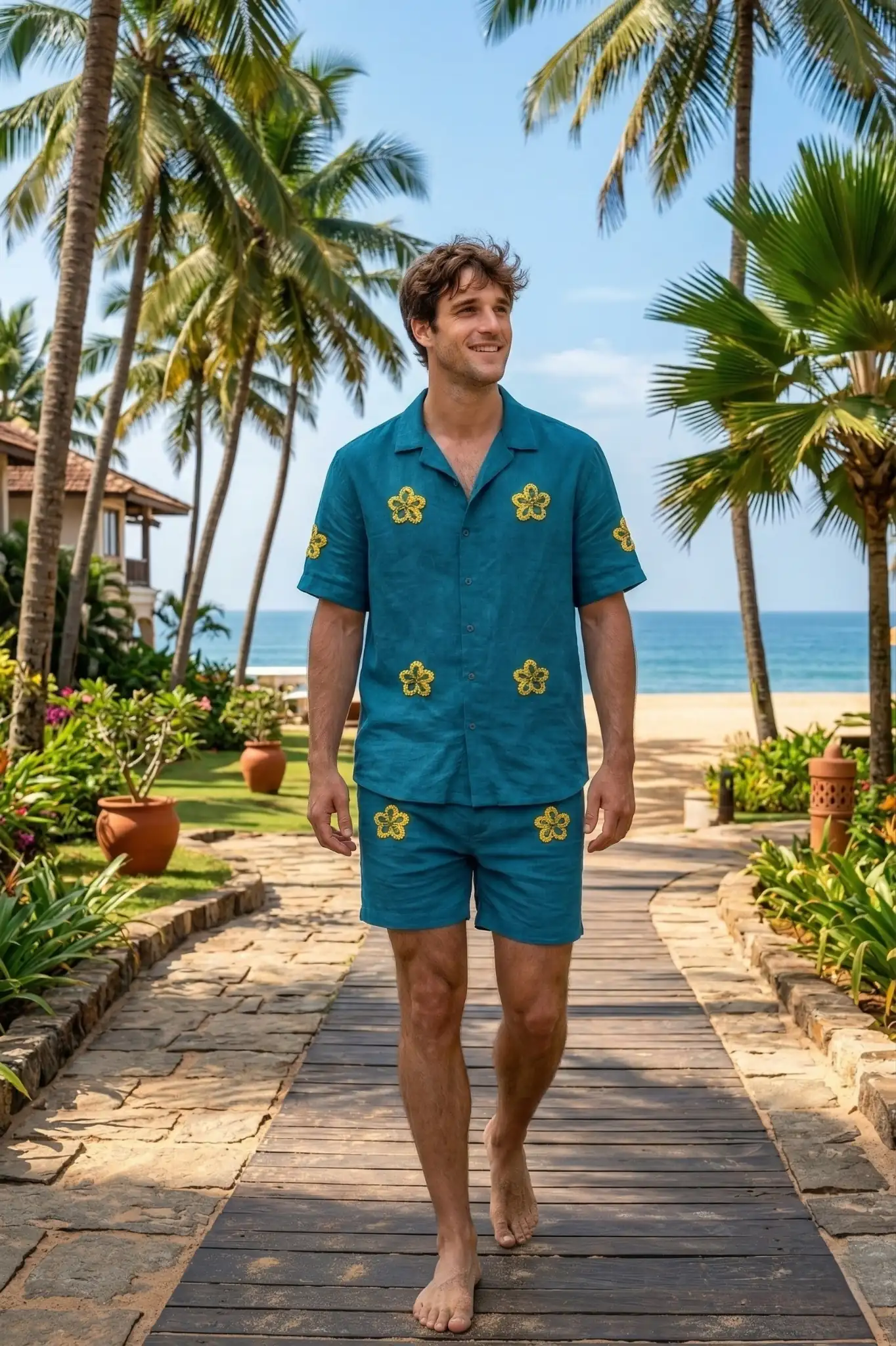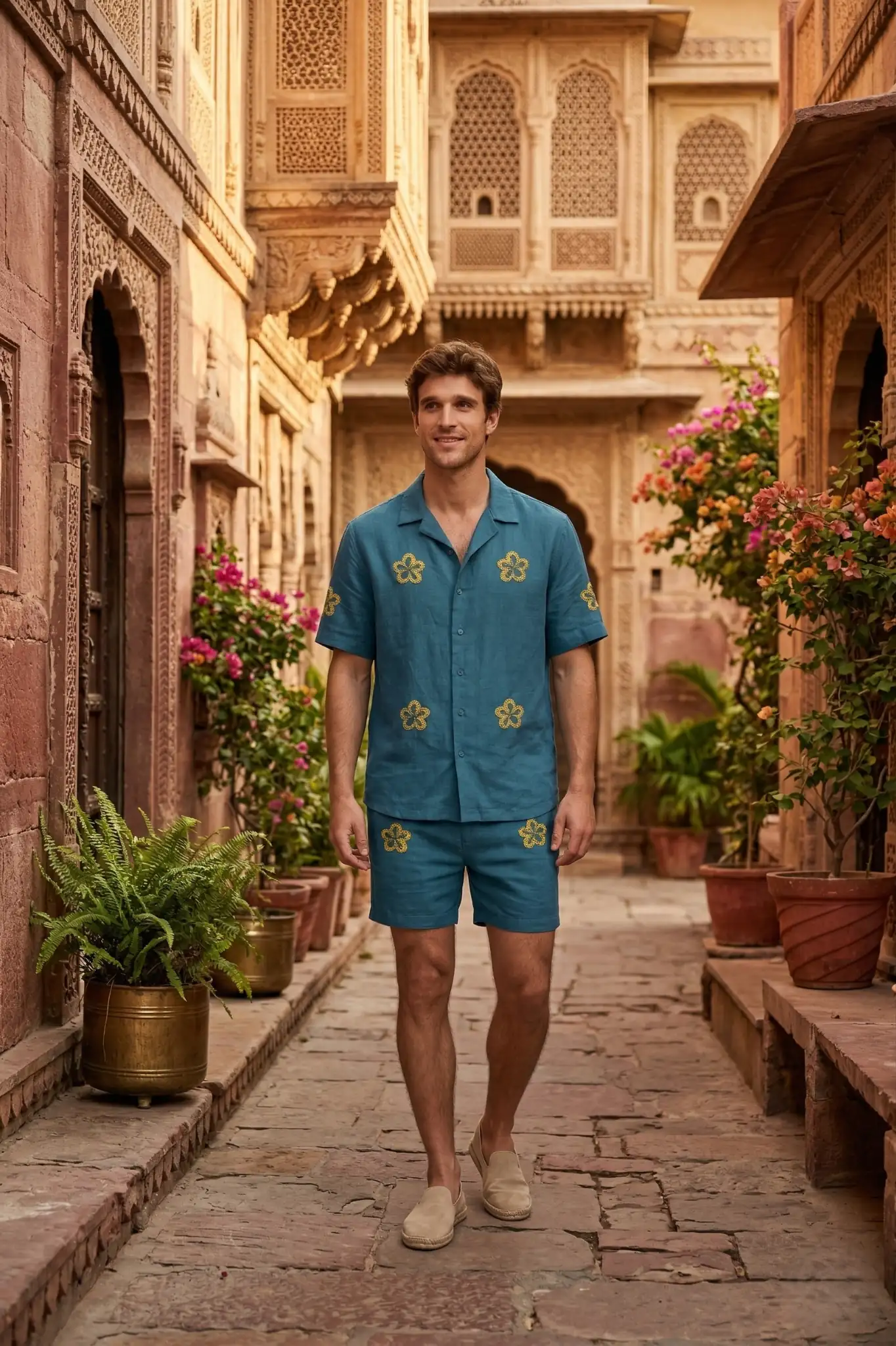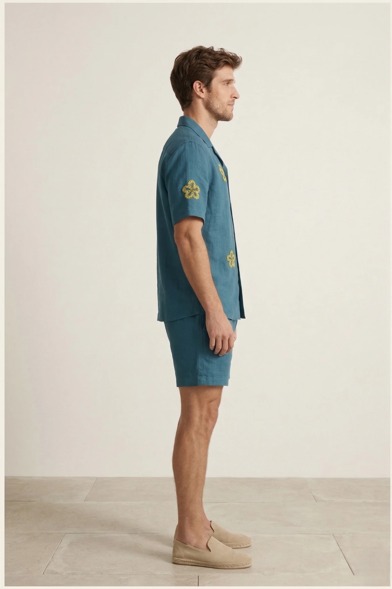 Teal Linen Cotton Cuban Collar Shirt & Shorts Co-ord Set for Men with Floral Embroidery
