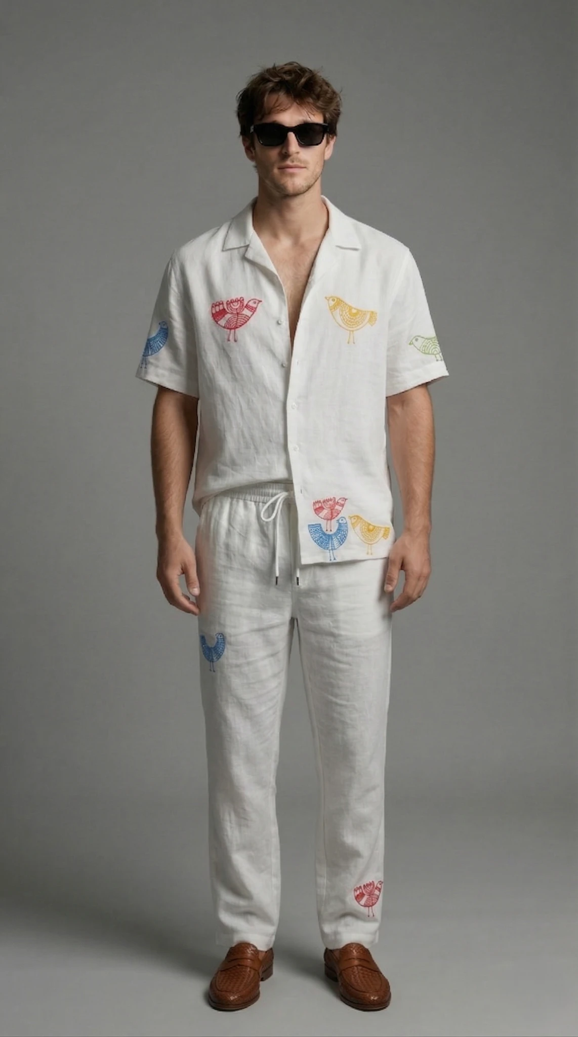 White Linen Cotton Cuban Collar Shirt for Men with Bird Embroidery | Luxury Summer Resort Wear Shirt