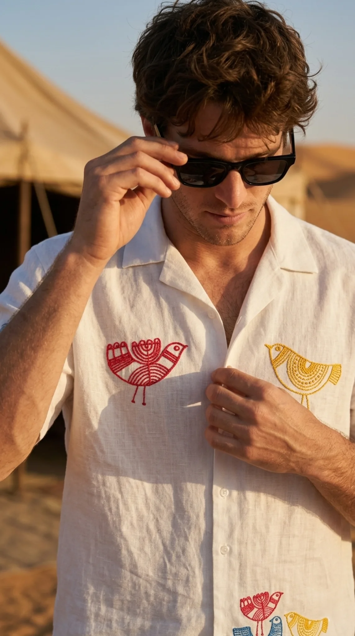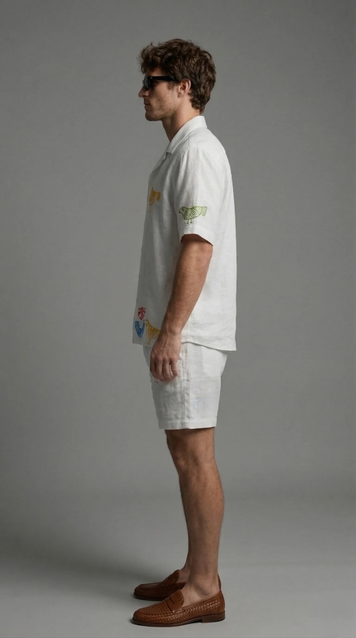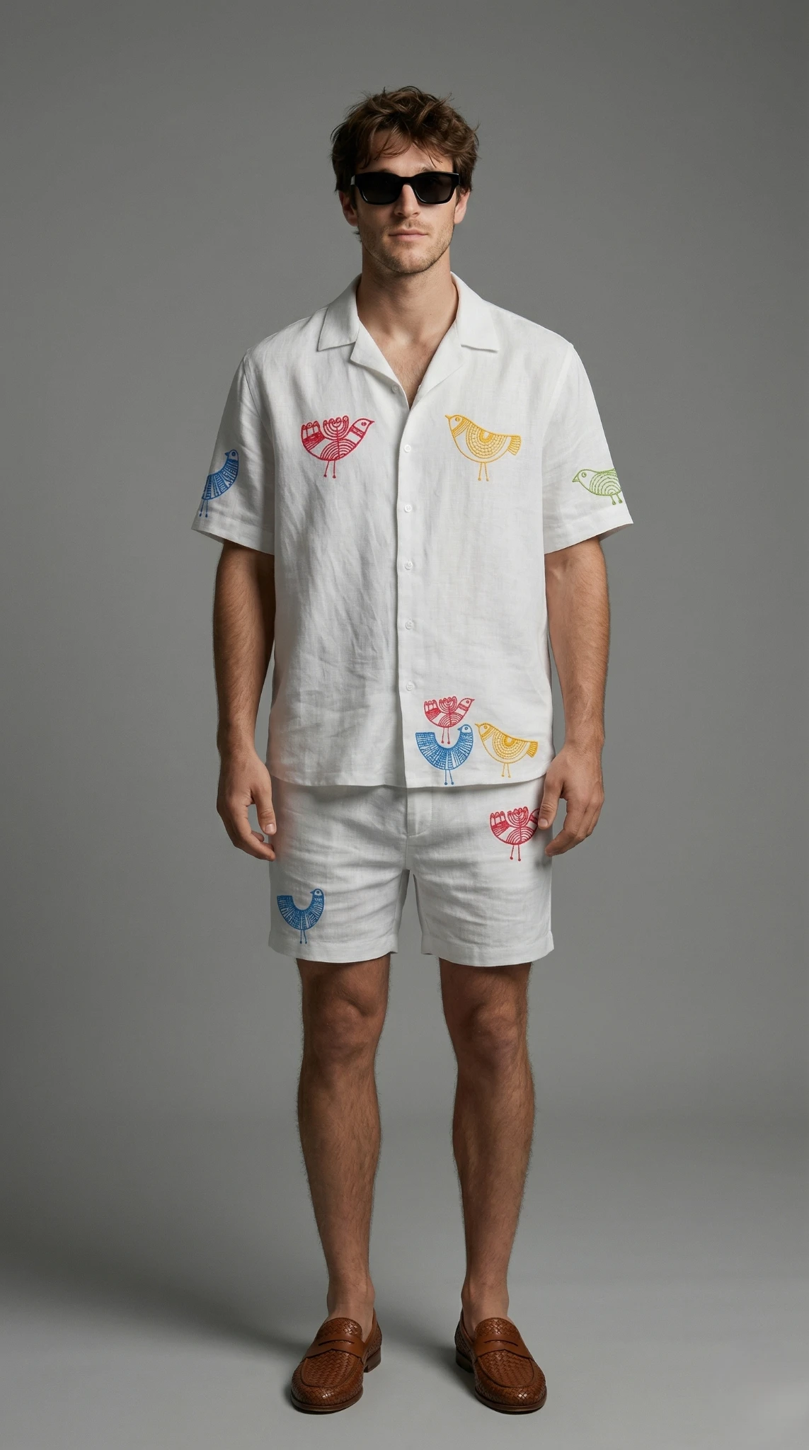 Make a bold statement with this premium white Cuban collar shirt and shorts co-ord set, featuring unique handcrafted bird embroidery.