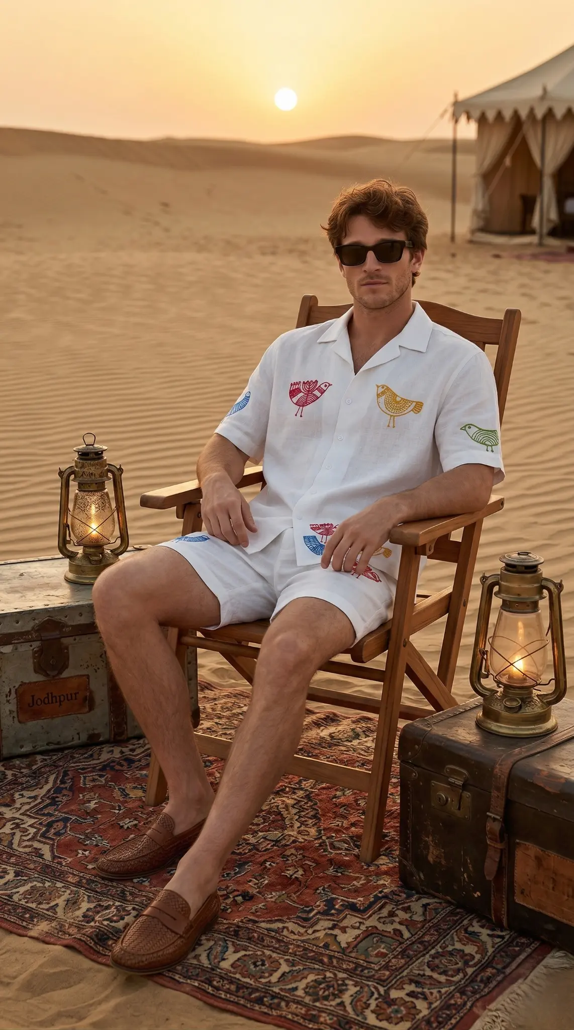White Linen Cotton Cuban Collar Shirt & Shorts Co-ord Set for Men with Bird Embroidery