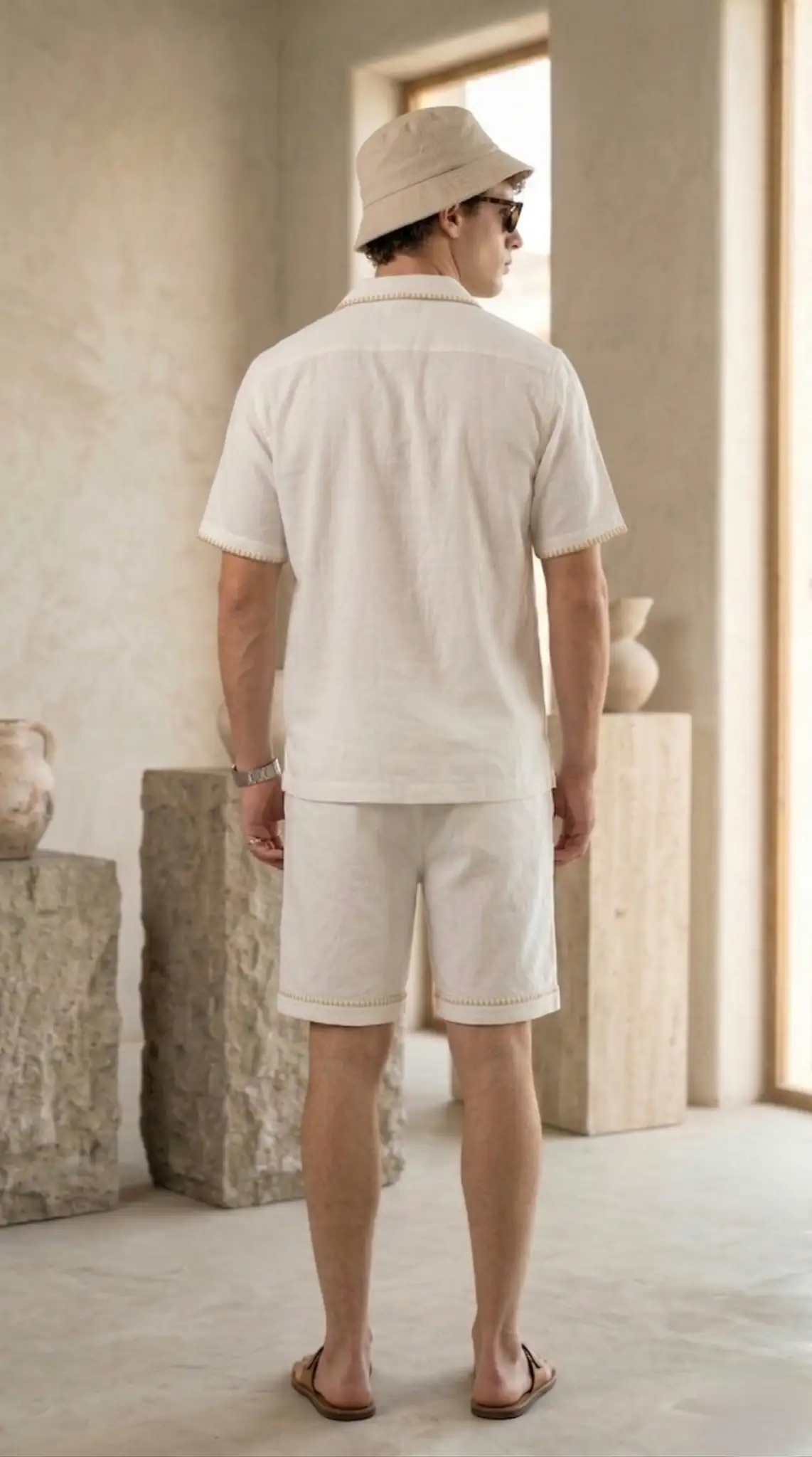 White Linen Shirt Shorts Set Men, Embroidered Cuban Collar Shirt, Summer Co Ord Set Men, Beach Outfit Men, Resort Wear, Vacation Outfit