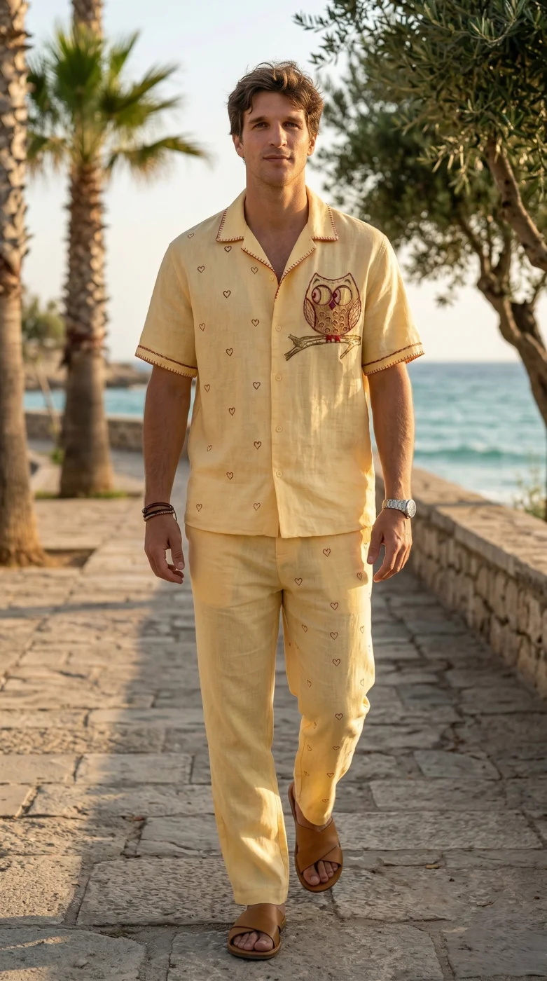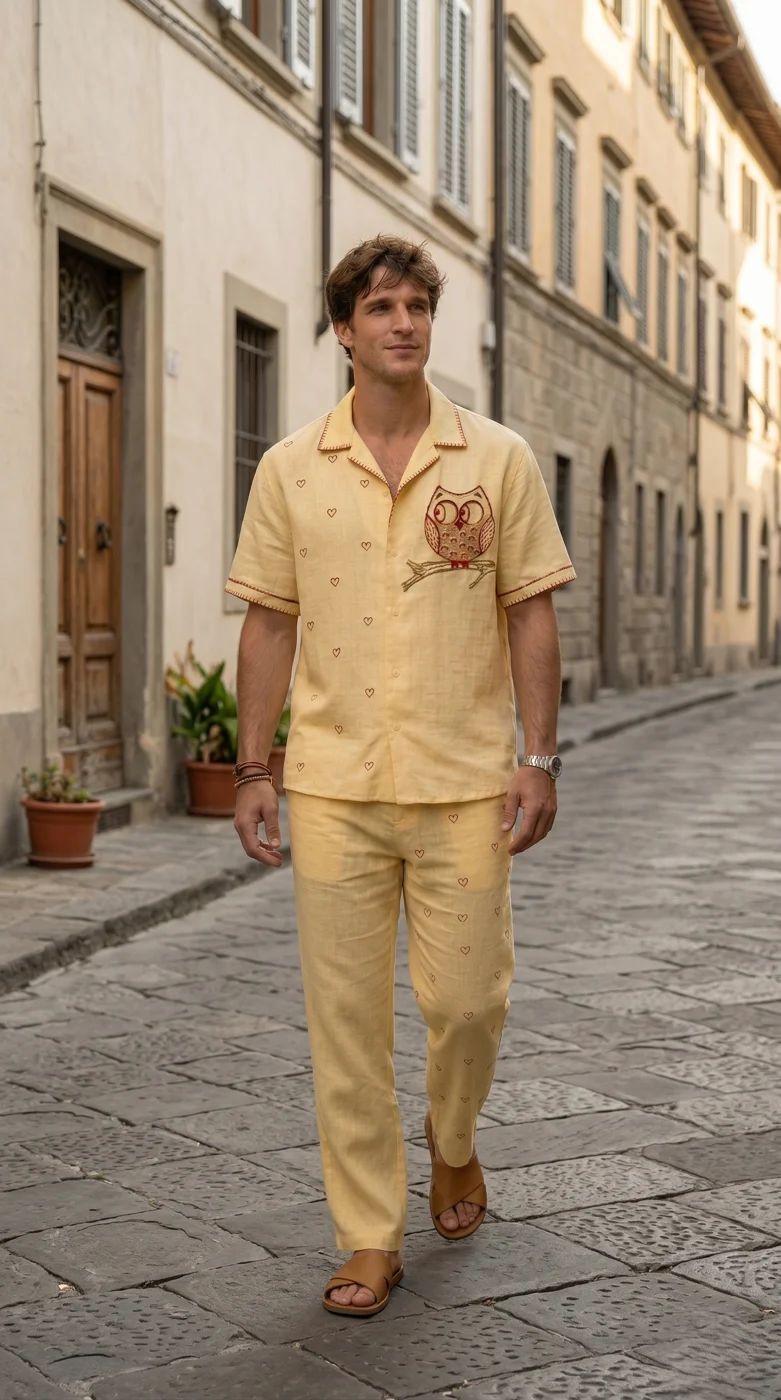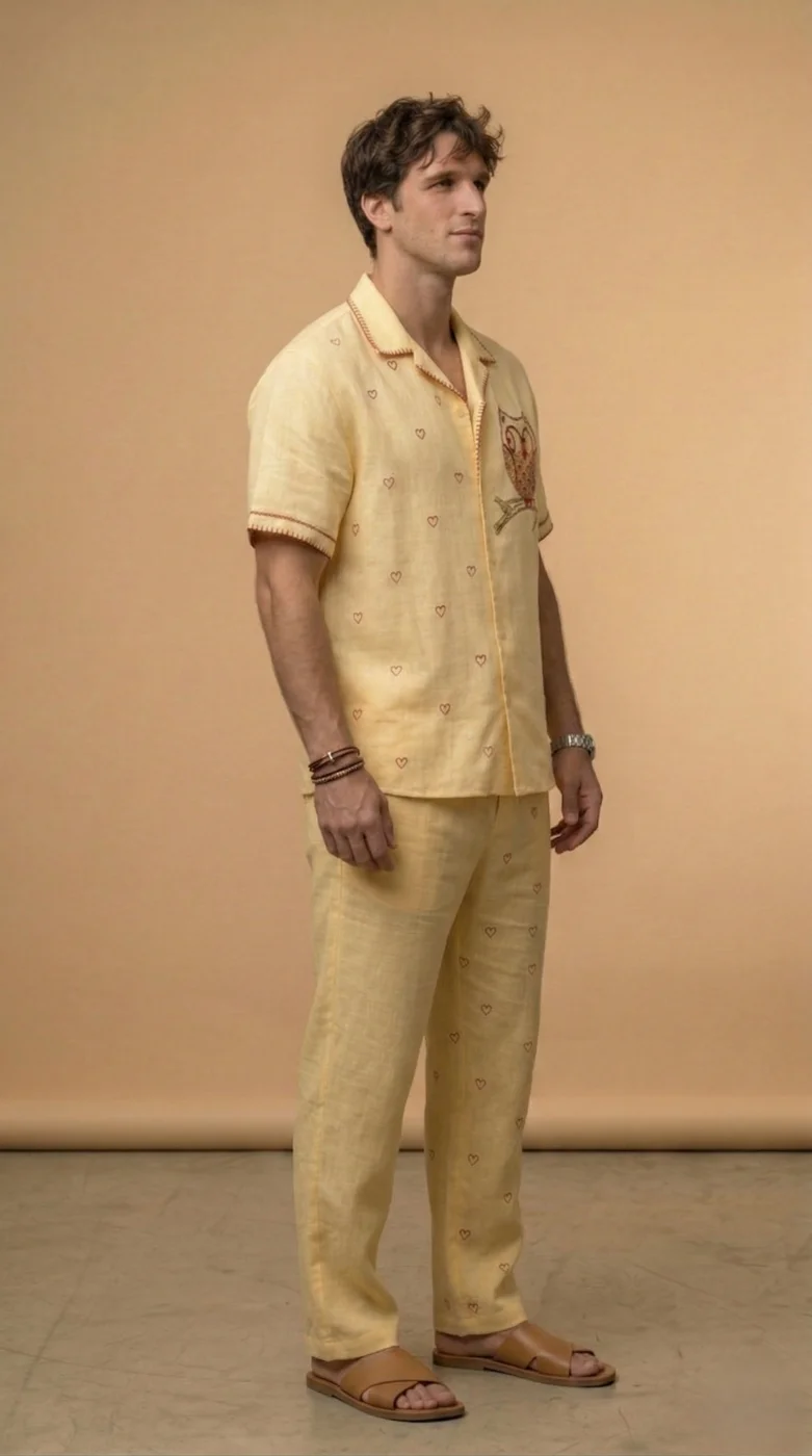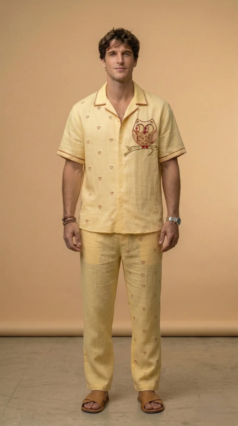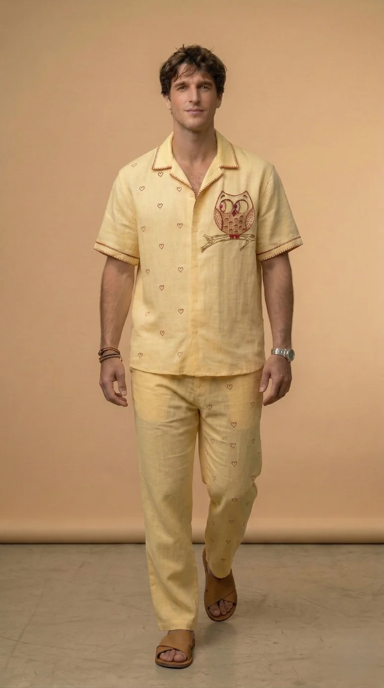 Yellow Linen Co-ord Set Men, Owl Embroidered Shirt Pant Set, Cuban Collar Outfit